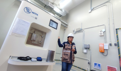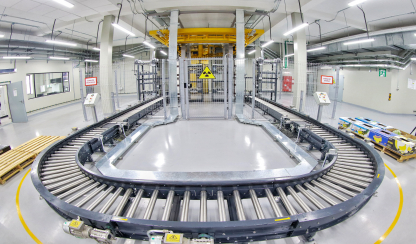 El Irradiador Industrial es una instalación especializada diseñada para aplicar irradiación gamma a diversos productos con el propósito de mejorar su inocuidad, calidad sanitaria y vida útil. Para ello, cuenta con un sistema altamente seguro y automatizado que permite exponer los productos a fuentes radiactivas bajo condiciones controladas. El proceso inicia con el sistema de transporte, que introduce los contenedores de aluminio con productos hacia la sala de irradiación mediante dispositivos de suspensión. Dentro del laberinto de concreto especialmente diseñado para proteger al personal de la radiación.